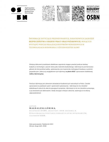 Niniejszy dokument przedstawia dodatkowe zagrożenia mogące powstać podczas budowy budynku w technologii z użyciem słomy jako materiału budowlanego. Informacja ta jest kierowana głównie do kierowników budów, wykonawców oraz inwestorów realizujących budowę w systemiegospodarczym. Zaleca się uwzględnienie tych informacji w planie BIOZ i opracowanie dodatkowejtablicy informacyjnej.
