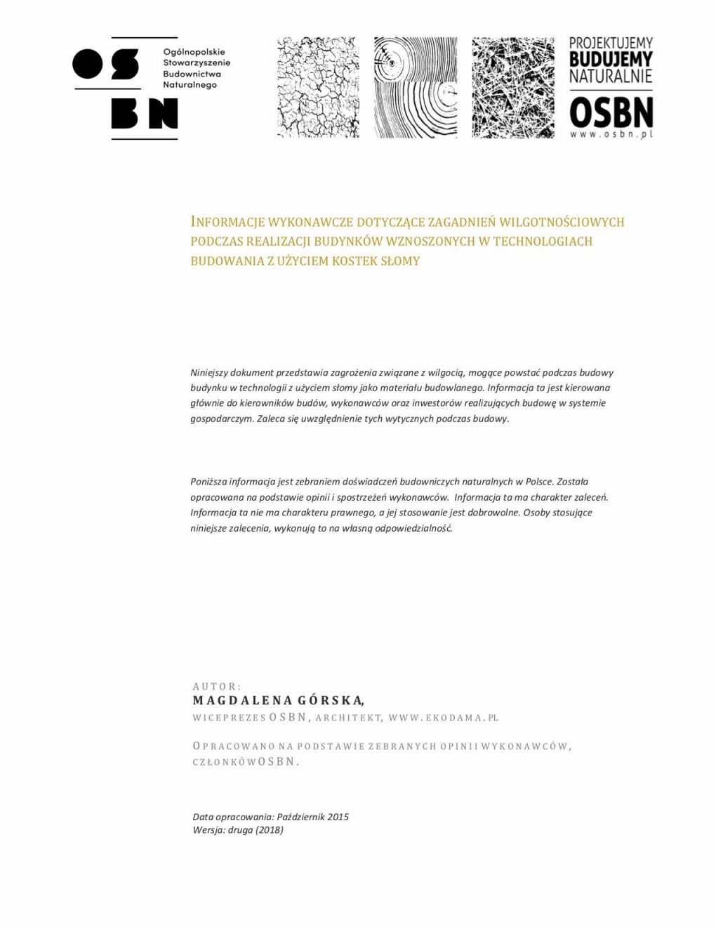 Niniejszy dokument przedstawia zagrożenia związane z wilgocią, mogące powstać podczas budowy budynku w technologii z użyciem słomy jako materiału budowlanego. Informacja ta jest kierowana głównie do kierowników budów, wykonawców oraz inwestorów realizujących budowę w systemie gospodarczym. Zaleca się uwzględnienie tych wytycznych podczas budowy. Poniższa informacja jest zebraniem doświadczeń budowniczych naturalnych w Polsce. Została opracowana na podstawie opinii i spostrzeżeń wykonawców. Informacja ta ma charakter zaleceń. Informacja ta nie ma charakteru prawnego, a jej stosowanie jest dobrowolne. Osoby stosujące niniejsze zalecenia, wykonują to na własną odpowiedzialność.